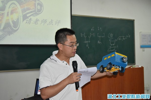 第二环节是选手依次上台展示ppt,选手沉着从容,将自己的赛车制作过程详细地为台下的观众讲解,场下不时有观众提问并展开交流互动。每三位选手展示完之后,都会有一位老师进行点评,在活动中获取知识,在点评中发现不足,让现场观众见识了汽车相关的专业技能和选手的创新知识。