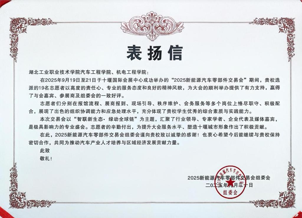 (通讯员李路)近日,公司bevictor伟德官网与机电工程公司收到来自“2025新能源汽车零部件交易会”组委会的表扬信,信中对两公司选派的19名志愿者在全程服务中的卓越表现予以高度肯定。
