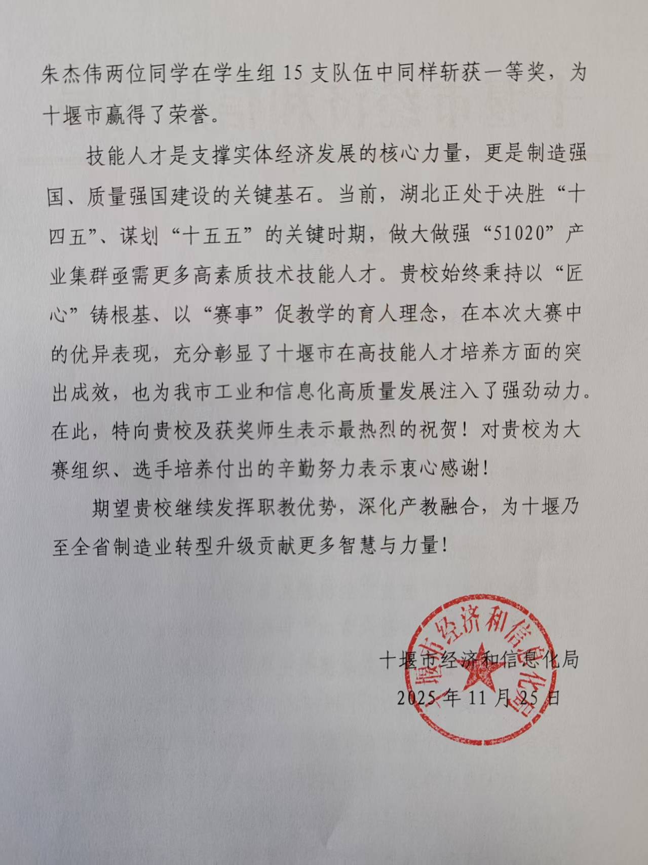 (通讯员 赵艳杰)近日,公司收到十堰市经济和信息化局发来的感谢信,对公司在“湖北省工业和信息化技术技能大赛暨全国大赛湖北省选拔赛”中给予的大力支持表示衷心感谢,对张超、王哲月两位教师以及刘诚、朱杰伟两位同学取得的优异成绩表示热烈祝贺。