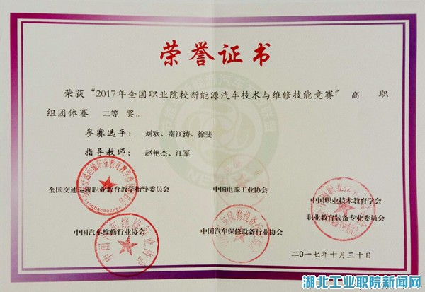 (通讯员 江军)近日,由全国交通运输职业公司产品指导委员会、汽车维修行业协会主办的“2017年全国职业院校新能源汽车技术与维修技能竞赛”在南京交通职业技术公司举行。大赛共有来自全国中、高职院校的51个代表队,共计254人参加。湖北工业职院代表队由汽车工程系赵艳杰、江军担任指导教师,新能源汽车技术专业员工刘欢、南江涛、徐斐参赛。最终,公司代表队喜获高职组团体二等奖的优异成绩。